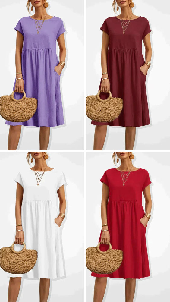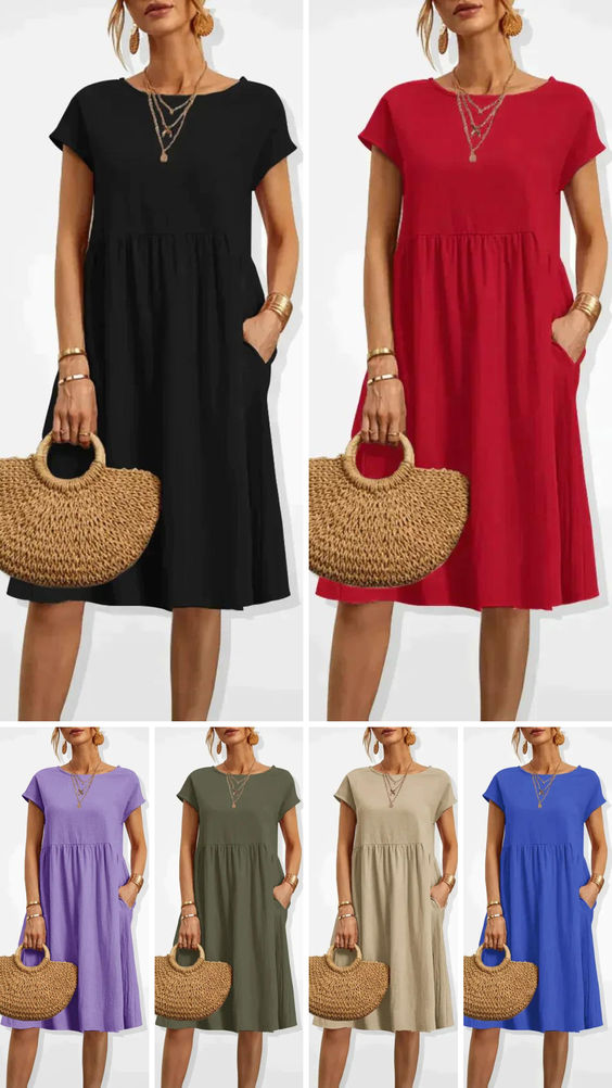 • Ubesværet elegance: Det knælange design, de korte ærmer og slidslommerne skaber et unikt og elegant look. Denne kjole er omhyggeligt udformet til at fremhæve din naturlige skønhed og samtidig give en behagelig pasform. Den er lavet af let og åndbart materiale for maksimal komfort selv på de varmeste sommerdage. Gør dig klar til at tiltrække alles opmærksomhed med en elegant og flydende silhuet, der udstråler selvtillid og stil.